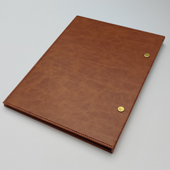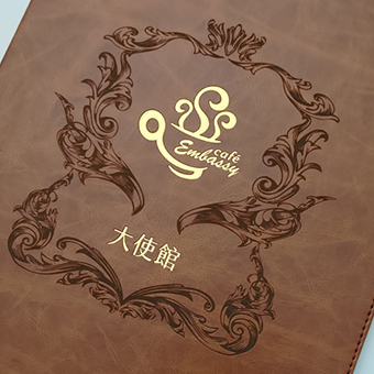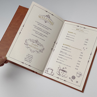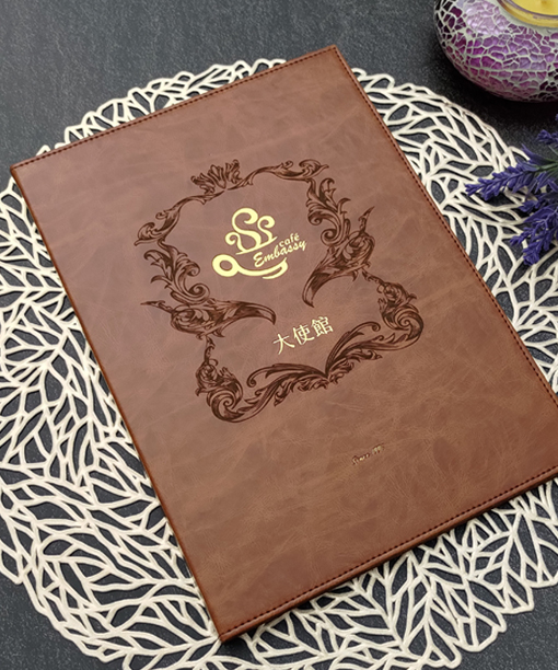 咖啡色合成皮質感細緻,觸感舒適,且經久耐用,即使經常翻閱也不會磨損。鉚釘裝方便更新內容,讓您的菜單始終保持最新。 菜單本的表面使用咖啡色與金色烙燙並使用針車車縫,營造出高雅、精緻的感覺,為餐廳增添一份尊貴和奢華 。