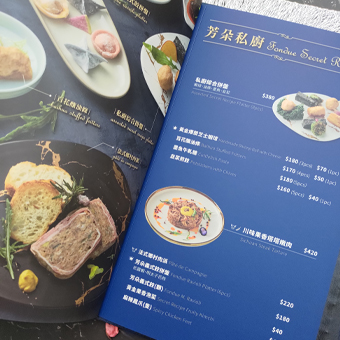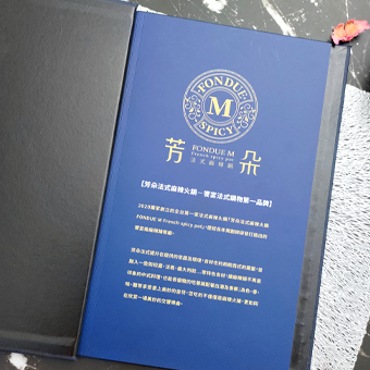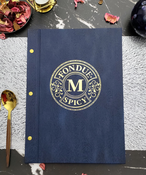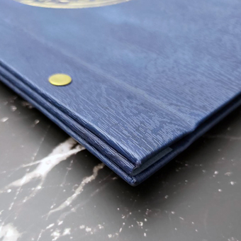 這本菜單本以環保藍色木紋變色皮。封面在光影下呈現細緻的木紋變化,展現低調卻不失高雅的風格。採用鉚釘裝訂設計,方便更換內頁,讓餐廳能靈活更新菜色資訊,保持新鮮感與專業度。封面廣告以烙燙金工藝呈現更具立體感,閃耀奢華氣息,提升整體格調。這不僅是一份菜單,更是品牌形象的延伸,讓顧客在翻閱的瞬間,感受到細節中的用心與品味。