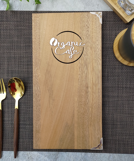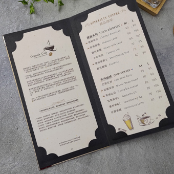 以木板為封面材料,展現自然質感與堅固耐用的特性。裝訂方式採用插卡翻頁式,不僅容易更換內頁,還兼具相片書的平整翻閱優點,讓菜單呈現更完整、更專業。封面廣告以雷射嵌入工藝製作,細緻精準,帶來獨特的立體感與高端質感。整體設計融合自然、靈活與精緻工藝,讓顧客在翻閱的瞬間,感受到品牌的用心與品味。